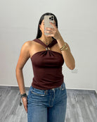 The Mocha Halter Top is your not-so-basic basic. With its sculpting stretch fit and twisted halter neckline, it creates instant shape while highlighting your shoulders and collarbone in all the right ways. The soft mocha hue adds that touch of luxe you can dress up or down, day or night.